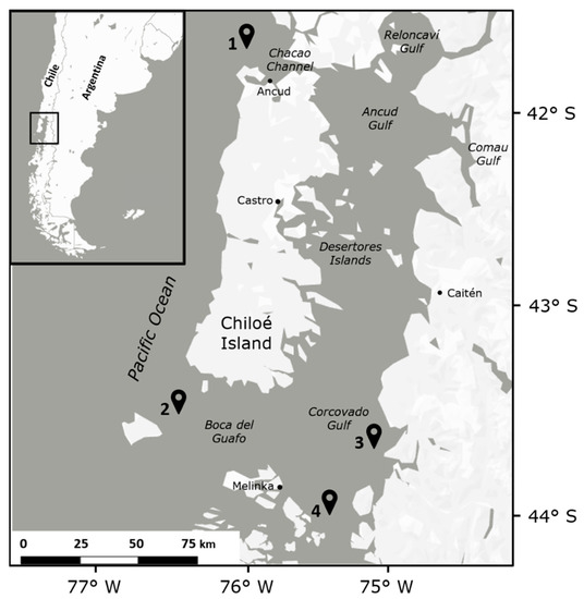 Map of the study area showing the four MARU deployment locations: 1. Northwest Chiloe, 2. Guafo North, 3. Tic Toc Bay, 4. Melimoyu.