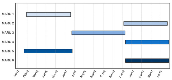 Acoustic data from the Chiloense Ecoregion in the south of Chile (~43° S–44° S, 71° W–73° W) were collected continuously during three five-month deployment periods, from the end of January 2012 to the end of April 2013, using six Marine Autonomous Recording Units (MARUs; Cornell University Laboratory of Ornithology’s K. Lisa Yang Center for Conservation Bioacoustics, Ithaca, NY, USA) deployed at four different locations: (1) Northwest Chiloe, (2) Guafo North, (3) Tic Toc Bay, and (4) Melimoyu (Figure 2). Deployment details are listed in Table 1 and periods of continuous recordings are visually displayed in Figure 3. MARUs were leased from Cornell University Laboratory of Ornithology’s K. Lisa Yang Center for Conservation Bioacoustics (formerly the Bioacoustics Research Program) and were programmed to record at a sampling rate of 2 kHz. Acoustic data were recorded to an internal hard drive and were accessible upon instrument recovery; recovered data were then extracted onto an external hard drive. Deployment sites were chosen to provide wide geographic coverage of the Chiloense ecoregion, from offshore areas such as Northwest Chiloe and Guafo North to areas closer to the Chilean continent such as Tic Toc and Melimoyu (Figure 2). Three MARU recovery attempts were unsuccessful; therefore, certain sites lack some temporal coverage [30].