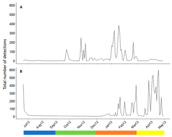 Total number of D (A) and SEP (B) call detections for 10 consecutive months of recording in Melimoyu: 19 June 2012–28 April 2013. Color bar represents seasons (blue: winter; green: spring; orange: summer; yellow: fall).