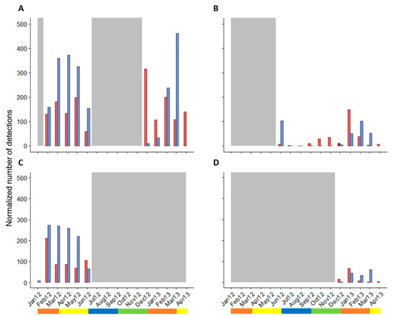 Normalized number of monthly D (red) and SEP (blue) call detections for each site: Guafo North (A), Melimoyu (B), Northwest Chiloe (C) and Tic Toc Bay (D). Periods shaded in grey indicate times when no data were collected. Colour bars represent seasons (orange: summer; yellow: fall; blue: winter; green: spring).
