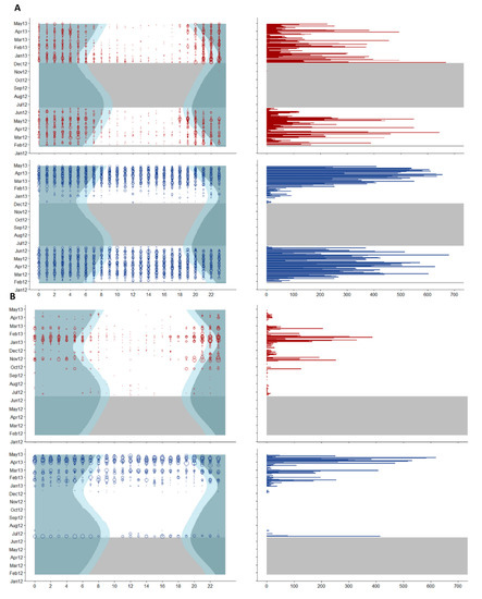 - Stafford, K.M.; Moore, S.E.; Fox, C.G. Diel variation in blue whale calls recorded in the eastern tropical Pacific. Anim. Behav. 2005, 69, 951–958. [Google Scholar] [CrossRef]