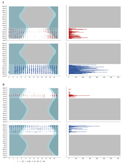 Diel distribution of blue whale D (red) and SEP (blue) call detections for each recording site: Guafo North (A), Melimoyu (B), Northwest Chiloe (C) and Tic Toc Bay (D). Left x-axis shows hour in Chilean Standard Time (CST); the right x-axis shows the daily total number of calls; y-axis shows the dates. Circles indicate the numbers of calls per hour, and the circle size is explained in the legend below the figure. Dark blue shading shows night periods, light blue shading shows twilight periods. Grey shading indicates periods of no recordings.