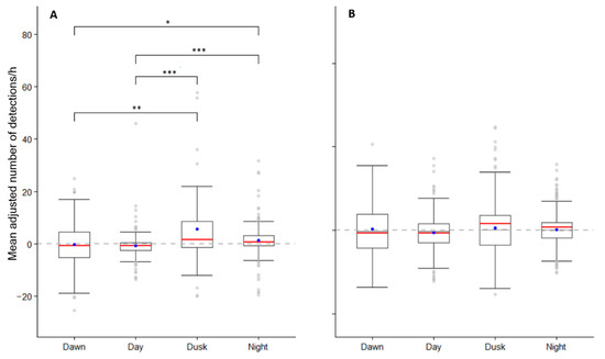 Boxplot of mean-adjusted number of D (A) and SEP (B) call detections per hour during four light regimes. Lower and upper bounds of whiskers represent lower and upper quartiles respectively. Red lines are median values, blue dots are mean values, and grey dots represent outliers. Asterisks denote statistically significant differences: * = p < 0.05; ** = p < 0.01; *** = p < 0.001. Note that means can differ from medians due to outliers.