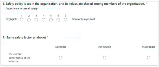 The gathered demographic information about the experts includes four variables, namely, job affiliation, job professional position, service time, and education level. The information is used to calculate the weights of experts in evaluating the fuzzy numbers (FNs) of SPFIs. In Section B, a seven-point Likert type scale is employed anchored with “Negligible (Very low)” and “Extremely important (Very high)” for the importance of an SPFI to human safety performance. A three-point Likert type scale is also employed with “Adequate”, “Acceptable”, and “Inadequate” options for the current performance of an SPFI which is applied in phase 3, shown in Figure 2, to evaluate the prior probabilities of CPCs. Figure 3 shows an example of questions for the SPFI of “SC1”.