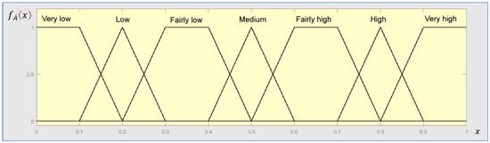 The conversion scale, which includes seven qualitative linguistic terms, is adopted for estimating the FNs of SPFIs as shown in Figure 4 [59]. This maps an expert’s judgment to a fuzzy set. For example, if an expert’s linguistic expression on the importance of an SPFI is “Medium”, then the fuzzy set is [0.4,0.5,0.5,0.6].