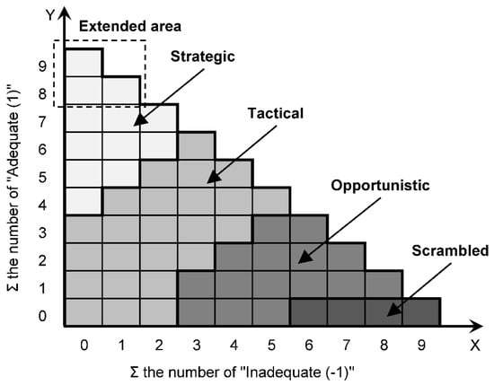 Building CPTs is core for a BN. Each CPC has three states, and there are nine CPCs; thus, there are 39=19,683 rows in the CPT of the COCOM node. In practice, it is a challenge to input a CPT with so many rows in the software; therefore, in order to simplify BN, some researchers have attempted to group CPCs into a few intermediate nodes based on some assumptions [49,51,53,56,57], or developed some assumed rules for the CPT of COCOMs node [52,54]. It is argued that these practices increased the uncertainty of the model, because to a certain extent, the formulation of these assumptions and rules is based on the subjective judgments of the researchers, thereby weakening the outcomes of these studies. In this study, the BN model is fully complied with the CREAM matrix without using intermediate nodes or assumed rules. A program based on the Microsoft EXCEL platform is compiled to calculate the CPT of the COCOM node based on Figure 6. The obtained CPT data can then be directly imported into the Netica software. The original CREAM matrix, in which y-axis has 8 values (0–7) is extended to 10, as each CPC has the states of “1”,”0”, and “−1”, as shown in Figure 6. Table 5 shows a part of the CPT, and the original code for the calculation of CPT is attached in Table S1 in the Supplemental Material available online.