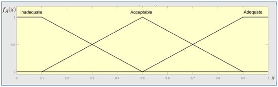 The prior probabilities of CPCs are necessary conditions for solving the probabilities of COCOM node’s states in the BN. The qualitative judgements of experts for the current performance of each CPC can be converted into the prior probability of each CPC through using the FST. As mentioned in Section 2.1.2, a three-point Likert type scale is used to express the current performance of CPCs; therefore, the conversion scale, which includes three qualitative linguistic terms, is adopted for quantifying the prior probability of each CPC as shown in Figure 7. In this model, “Inadequate” represents the negative effect (-1); “Acceptable” represents the no significant effect (0); “Adequate” represents the positive effect (1). The trapezoidal fuzzy numbers’ membership functions are expressed by Equation (8)–(10).