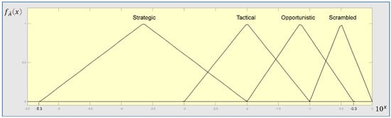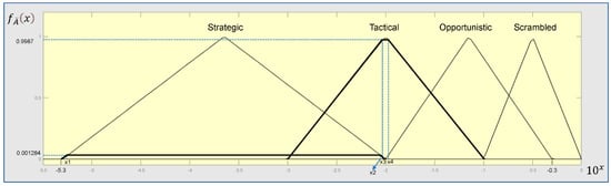 The fuzzy sets for COCOM node’s states according to Table 2 are shown in Figure 8. The trapezoidal fuzzy numbers’ membership functions are expressed by Equation (11)–(14). Equation (4) is then used to perform the defuzzification process of the trapezoidal fuzzy set , where