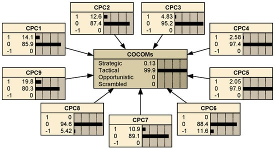 The aggregation and defuzzification methods used in this step are the same as what was described in Section 2.1.4 and Section 2.1.5. The FNs of CPCs are designated as the prior probabilities of CPCs. Once the prior probabilities of CPCs are assigned to the associated nodes, the probabilities of COCOM node’s states can be obtained through running the BN model.