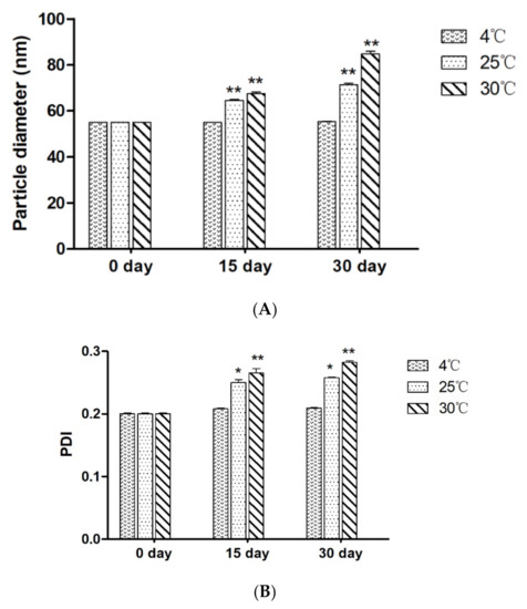 3.2.1. Stability of the Prepared Massoia Lactone-Loaded NEs during the Storage at Different Temperatures