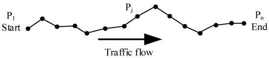 The research aims to characterize ship travel behaviors and shipping routes in the port area using AIS data. The extraction of ship travel behaviors starts by grouping ship trajectories following the same voyage and by clustering static or entry and exit points corresponding to starting and ending locations of the travel behavior. A shipping route is assumed as a set of straight segments or legs connecting waypoints delivered from AIS data, corresponding to positions of significant changes in the navigational behavior of the ships, which allows a compact representation of ship travel behaviors. Accordingly, the shipping route is digitized as , seen in Figure 1, and is a point in the digitized route, containing the MMSI of the ship, timestamp, position, speed, and course et al., see in Formula (1) and Table 1.