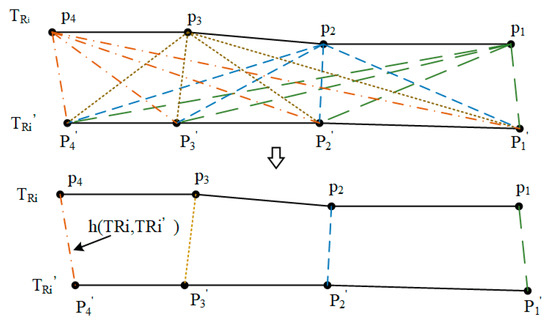 The and denote the distance of trajectory, to , and distance of ship trajectory, and . Furthermore, the calculation process of is illustrated using the Hausdorff distance, see in Figure 3. Accordingly, a loop is used to calculate the distance of point in trajectory to all points in trajectory and select the minimum distance to amount them as the spatial dissimilarity (distance) of point in trajectory to all points in trajectory .