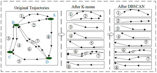 Figure 4 illustrates the implementation process of the proposed hybrid clustering. The original data includes trajectory 1 to trajectory 8, where trajectories 3 and 4 are opposite, trajectories 1 and 2 have the same departure and destination and have a difference in their path, while trajectories 6 and 7 have a difference in trajectory length. In detail, firstly, the trajectories are classified into six categories after K-Means clustering, where trajectories 1 and 2 are in one category and trajectories 6 and 7 are in another category, based on the features of the departure and destination of the ship trajectory. Then, based on DBSCAN clustering, trajectories 1 and 2 and trajectories 6 and 7 are separated using the dynamic characteristics of ship trajectory using comprehensive dissimilarity. Finally, all types of trajectories are obtained, including abnormal ship trajectories.