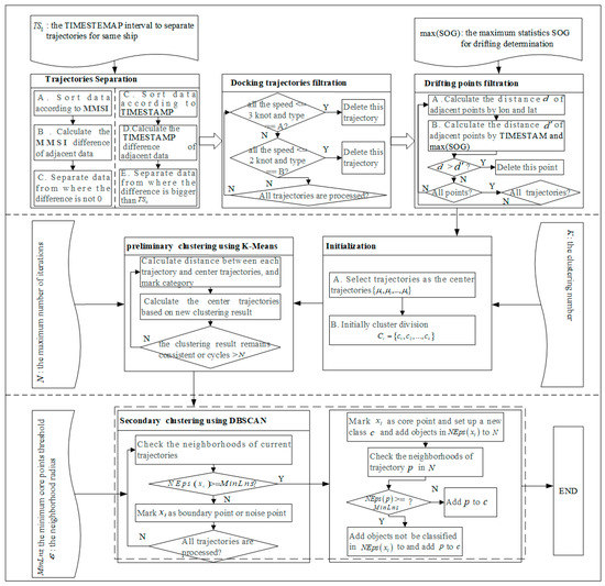 As mentioned before in Section 3.1 and Section 3.2, the ship trajectory contains various dimensional information, so the general data clustering algorithms, including K-Means clustering, hierarchical agglomerative clustering, and DBSCAN clustering cannot be used directly to cluster the ship trajectories data. There are specific requirements for the ship’s trajectory characteristics. For the trajectory clustering of a specific area, the number of trajectory types can be determined according to the positions of departure and destination of trajectories. The longitude and latitude of the ship position can be averaged. Fortunately, the characteristics of the K-Means algorithm can be combined to classify the various ship trajectories based on the static characteristic of ship trajectories (see in Figure 4). After that, the delivered cluster also contains different types of ship trajectories, including trajectories along different routes and abnormal trajectories. Then, the DBSCAN algorithm is used to cluster the delivered clusters based on K-Means and identify abnormal ship trajectories.