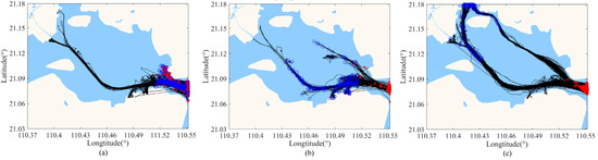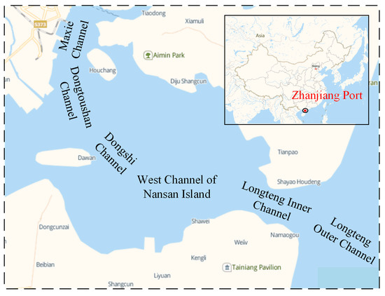 The location of Zhanjiang Port is shown in Figure 6, where the latitude and longitude are 21°11′21″ N and 110°24′21″ E, respectively. The sections from the entrance to the port are divided into the outer section of the Longteng Channel, the inner section of the Longteng Channel, the West Channel of Nansan Island, the Dongshi Channel, the Channel of Dongtou Mountain, and the Maxie Channel. The first five channels are 300,000-ton-class channels, while the channels from the Maxie Channel to the north are 70,000-ton-class, and channels navigation rules are set for each channel. At present, there are about 113 productive berths and 18 main anchors in the port. Due to the complex environment and a large number of ships, the analysis difficulty of marine traffic characteristics increased, and the requirement of navigation management is enhanced simultaneously.