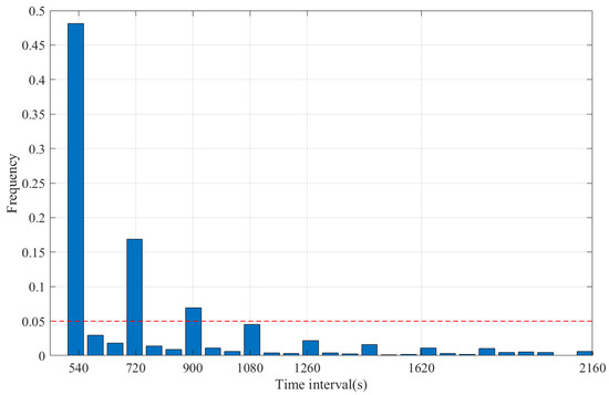 For a reasonable separation of ship trajectories, the broadcast time interval of AIS is counted to obtain a time-division interval threshold. Since the time interval of AIS data sent by docked ships is generally 180 s and the trajectory should be continuous when the ship has a short docking, the time interval of the adjacent data from the same ship is set as greater than 500 s and less than 3600 s for statistics shown in Figure 7. The number gradually decreases as the time interval increases, and the values are mainly distributed in multiples of 180. On this basis, the time interval of 1080 s (less than 0.05) is determined in this paper, and the adjacent data of the same ship are divided into different trajectories when the time interval between them exceeds 1080 s. At the same time, trajectories less than 10 points are not considered. After pretreatment, 4610 ship trajectories are obtained, including 2882 moving trajectories and 810 docking trajectories. The rest are less than 10 points. In these moving trajectories, there are 824 vessels, which are the analysis objects in this work. The distribution of moving trajectories is shown in Figure 8. It can be seen that departures and destinations of trajectories are mainly distributed in the channel and berthing area while there are a lot of chaotic motion trajectories.