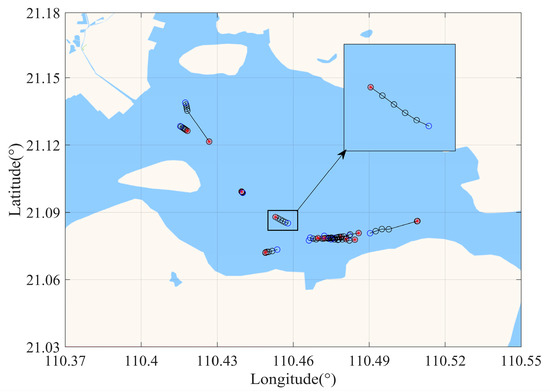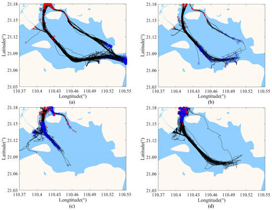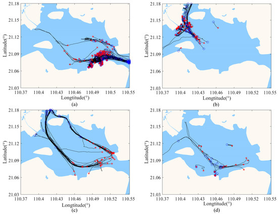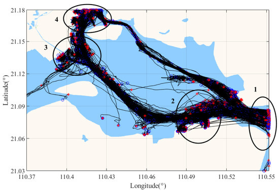The original moving trajectories in Zhanjiang Port (The red ‘*’s represent departures, the blue ‘o’s represent destinations).