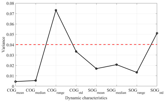 The ship navigates in real operational conditions where the dynamic parameters vary in real-time. Thus, the motion parameter variation also is an essential feature of ship trajectory. Accordingly, the motion parameter variation feature is extracted using the outputs of statistical analysis of the entire voyage, such as variable interval and standard deviation of the dynamic parameter (speed, course) during the voyage, which is constructed as shown in Formula (6). The , , , and denote variable interval and standard deviation of speed and course over ground.