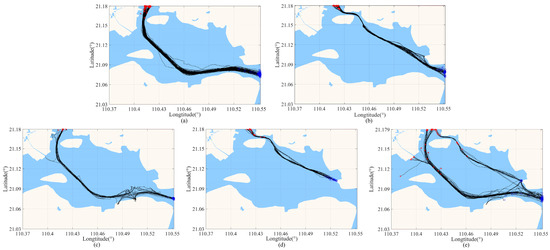 Accordingly, the DBSCAN algorithm has better applicability than other algorithms because it can identify the trajectories of different shapes and has the ability to identify anomalies [25,26]. Lee et al. [27] segmented ship trajectories and clustered the sub-trajectories using the DBSCAN algorithm. However, the paper only analyzes the similarity of the sub-trajectories using static data, such as the distances between the trajectories (including vertical distance, parallel distance, and directional distance), which are more suitable for calculating the distance between straight-line segments. Zhao et al. [25] realized the separation of ship trajectories through multilayer DBSCAN clustering based on Lee’s research. The difficulty of applying the DBSCAN algorithm lies in selecting the parameters, as parameters have an essential influence on the effectiveness of the algorithm. On the one hand, there were no fixed rules for the parameter selection. Ships were free to navigate on the water’s surface; thus, the distribution of ship positions was scattered, which led to a significant difference in trajectories, and the parameter selection process was cumbersome. Li et al. [28] used the dynamic time warping (DTW) algorithm to calculate the ship’s trajectory distance and the K-Means algorithm to cluster the ship’s trajectory, but the number of trajectories was small, and the trajectory model was relatively simple. The validity of the simulation needs further verification. For the study of ship trajectory, in addition to the clustering algorithm, a classification method is also included. Sheng et al. [29] first divided ship trajectories into mooring trajectories, straight trajectories, and turning trajectories, segmented the ship’s trajectory characteristic values, and then used logistic regression to classify the trajectories.