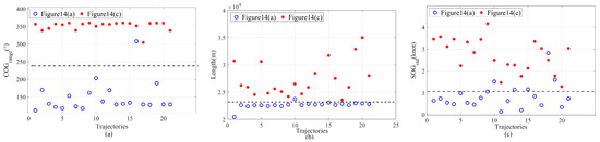 Ship speed and course are important dynamic parameters for ship trajectory clustering. Navigation speed is affected by the other ships and the hydrological conditions, such as traffic density and the direction of the waves or currents, etc. For example, the average speed of ships sailing along the current is significantly higher than against it. On the other hand, the course is determined by departure, destination, and the waypoints of the route, and the course is opposite coming and returning. Thus, the value of course is variable depending on the voyage. Accordingly, the average and the median are set as the central trend feature, as shown in Formula (5). The and represent the average and median values of speed, whereas the and are the average and median values of course, respectively