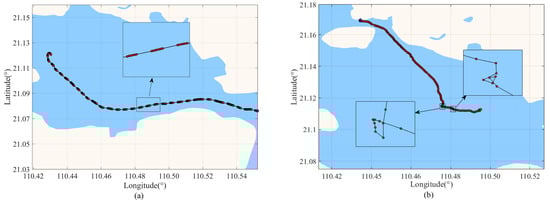 AIS data reconstruction includes trajectory separation, abnormal data filtering, and docking trajectory filtering. It is noted that the calculation of trajectory lengths is based on longitude and latitude, and drift data will have a negative influence on the characteristics of the ship trajectories. Therefore, it is necessary to filter abnormal data that obviously drift. The AIS data should be checked and revised to enhance clustering accuracy, including longitude, latitude, speed, and course.