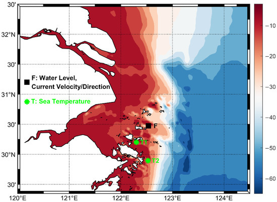 The Changjiang River (CR) estuary and its adjacent sea is the largest estuary along the coast of the East China Sea (Figure 1). CR, as the third-largest river in the world, is by far one of the most important ways of discharging water and sediment directly into an estuary. The annual amount of freshwater discharge of CR can reach 31,900 m3/s, with a significant seasonal variation [1,2,3]. The hydrodynamics in the CR estuary and its adjacent sea are influenced by various factors, such as river discharge, atmospheric forcing and tidal mixing. Among these factors, the effect of freshwater has dominated the surface distribution of water properties [1,4].