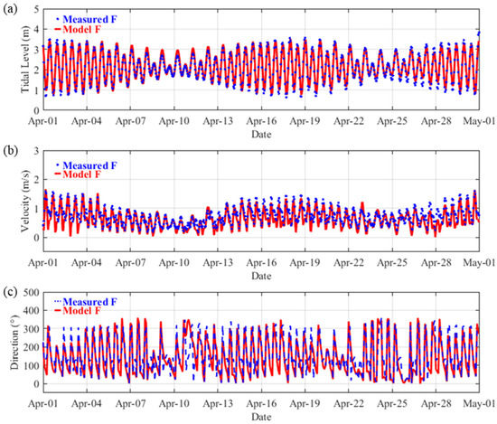 Verification of (a) water level, (b) current velocity and (c) direction (1–30 April 2018).