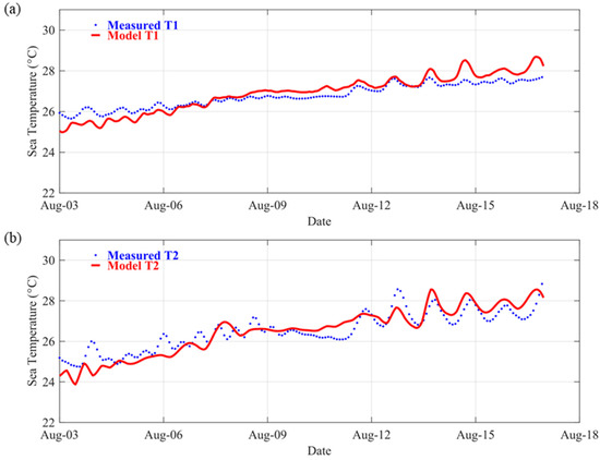 Verification of sea temperature in (a) T1 and (b) T2 (3–17 August 2019).