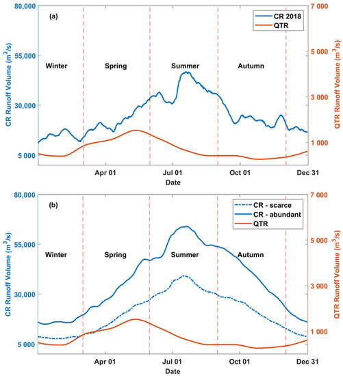The runoff volume set in (a) case 1—2019, (b) case 4—abundant and case 5—scarce.