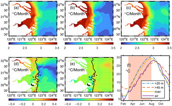 The effect of the runoff on the heating rate of surface temperature during the warm season. (a) with real runoff flux in 2019, (b) without runoff flux, (c) with maximum runoff flux, (d) b minus a, (e) c minus a (the black lines indicate 20 m isobath), (f) the variation in the nearshore shallow sea temperature, offshore deep sea temperature, CR inflow temperature and air temperature near sea surface, the red shaded areas indicate the warm season.