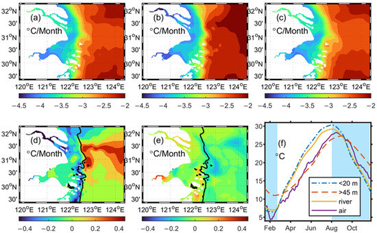 The effect of runoff on the cooling rate of surface temperature during the cooling season. (a) with real runoff flux in 2019, (b) without runoff flux, (c) with maximum runoff flux, (d) b minus a, (e) c minus a (the black lines indicate 20 m isobath), (f) the variation in the nearshore shallow sea temperature, offshore deep sea temperature, CR inflow temperature and air temperature near sea surface, the blue shaded areas indicate the cooling season.