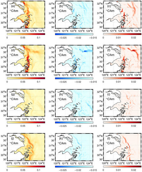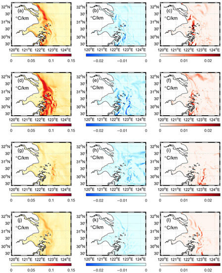 In winter (Figure 7j), with the temperature of the CR estuary and Hangzhou Bay area dropping significantly, fronts start to emerge on the steep slope between 122.5° E and 123° E with magnitudes of approximately 0.05 °C/km. The comparison shows that the abundant runoff flow can strengthen the fronts out of CR near the 123° E (Figure 7l) with increments of approximately 0.015 °C/km or more. The distribution region of the bottom and surface temperature fronts are similar because the water column mixes well in the vertical direction, but the fronts near the CR estuary in the bottom are weaker than those on the surface (Figure 8j). Furthermore, the influence of abundant runoff flow on the bottom fronts is smaller than the surface fronts due to the smaller .