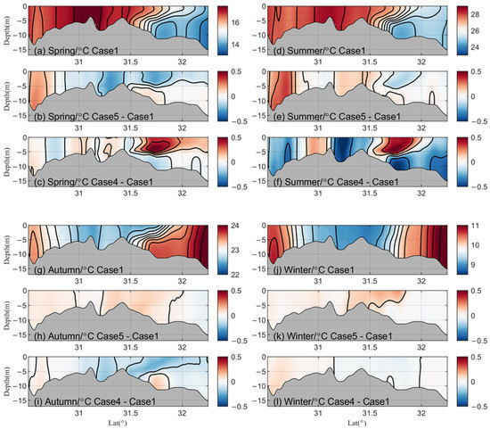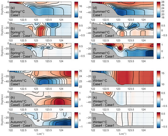 The sectional distribution of sea temperature (°C, 122.2° N). (a,d,g,j) (case 1 results in Spring, Summer, Autumn and Winter); (b,e,h,k) (the difference between case 1 and case 5 in Spring, Summer, Autumn and Winter); (c,f,i,l) (the difference between case 1 and case 4 in Spring, Summer, Autumn and Winter).