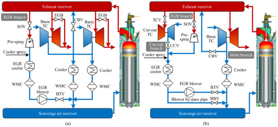 Although the EGR system has been proven effective to reduce the marine engine’s NOx emissions to the TIII limits, it is essential to employ an effective turbocharging system that compromises the contradictory turbocharger (TC) matching requirements [44] operating with the EGR system switched on or off, so that the engine achieves the highest possible efficiency. The low-pressure EGR (LP-EGR) system only slightly affects the TC performance [45,46] since it is installed at the turbine outlet and the compressor inlet, i.e., the engine low pressure side. However, the LP-EGR system has higher requirements for exhaust gas filtration and cleaning, especially for marine two-stroke diesel engines that use heavy fuel oil. Moreover, the LP-EGR system is not as compact as the high-pressure EGR (HP-EGR) system, as low pressure leads to lower density of the EGR loop working medium [47]. The following two HP-EGR configurations are the most typical for marine two-stroke diesel engines [48]: