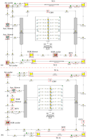 Flowcharts of GT-SUITE models for: (a) the baseline (BL-EGR) engine configuration; and (b) the alternative (AL-EGR) engine configuration.