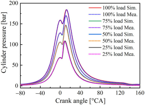 The M+P Analysis model is a single-cylinder engine model that includes the injector and the engine crank train. The air volumetric efficiency and the air trapping ratio of using the cylinder at 25%, 50%, 75%, and 100% engine loads were provided as inputs (instead of the scavenging model). This model employs the DI-Pulse combustion model to predict the in-cylinder pressure variation. The calibration of the injection model and the preliminary calibration of the combustion model were carried out by comparing the predicted and measured cylinder pressures.