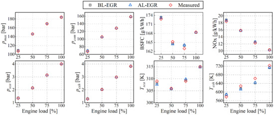 Simulation runs with the models of the BL-EGR and AL-EGR engine configurations at the TII mode (EGR system switched off) were conducted. Figure 4 presents the predicted results and their comparison with the respective measured values. As illustrated in Figure 5a,b, the relative percentage errors (between the measured and predicted values for the engine BL-EGR and AL-EGR configurations are found to be less than ±3.2%. The simulation predictions are in sufficient agreement with the measured values. Figure 5c presents the relative percentage difference between the predicted parameters from the models for the BL-EGR and AL-EGR engine configurations. As deviations less than ±0.8% were exhibited, it is deduced that the developed models can be used for the comparative assessment of the two engine configurations.