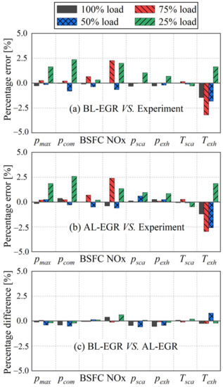Relative percentage errors of the engine at the Tier II mode: (a) between predicted and measured values for the BL-EGR engine configuration; (b) between predicted and measured values for the AL-EGR engine configuration; and (c) predicted values for the BL-EGR and AL-EGR engine configurations.