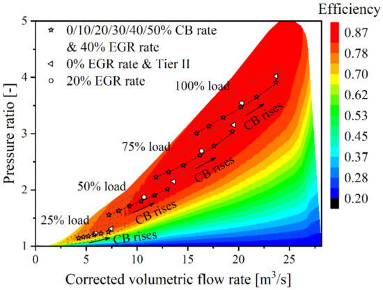Impact of the EGR rate and the CB rate on the compressor operating points of the BL-EGR engine configuration.