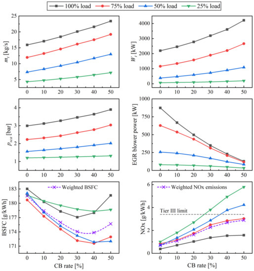 As presented in Figure 8, the turbine power and exhaust gas mass flow increase with the increase of the CB rate at all investigated loads. Consequently, the adverse impacts for the EGR system operation on the compressor are attenuated. As shown in Figure 7, the compressor operating points for all investigated loads almost approach their position corresponding at the TII mode (0% EGR rate) whilst the CB rate increases to 50%. The scavenge air receiver pressure is also restored close to the respective levels at the TII mode. As a result, the engine BSFC is improved compared to the case of the closed CB valve, whereas the NOx emissions gradually increase. The minimum BSFC values are exhibited in the region of 30–40% CB rate, depending on the engine load. This is attributed to the compressor efficiency, which gradually approaches its peak value and then is reduced. It is deduced from Figure 7 that an optimal point of the CB rate exists for every load that minimises the BSFC, whilst the compliance of the weighted NOx emissions to the TIII limits is ensured. The CB rate optimal values (to achieve the lowest BSFC) are 40% for 25%, 50%, and 75% loads, whereas it is 30% for 100% load. Considering the weighted BSFC, the CB rate optimal value is about 35% and provides the minimum weighted BSFC of about 173.6 g/kWh.