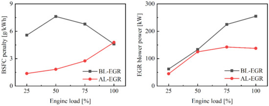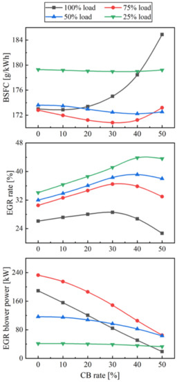 In addition, the electrical power consumption of the EGR blower reduces with the CB valve opening, which is attributed to the lower pressure rise (from the exhaust gas receiver to the scavenge air receiver). When the CB system is deactivated, the EGR blower power is around 1.3%, 2.1%, 3.4%, and 3.6% of the engine brake power at 25%, 50%, 75%, and 100% loads, respectively, whereas it reduces to around 0.8%, 1.0%, 1.1%, and 1.4%, respectively, when optimal CB rates values are used.