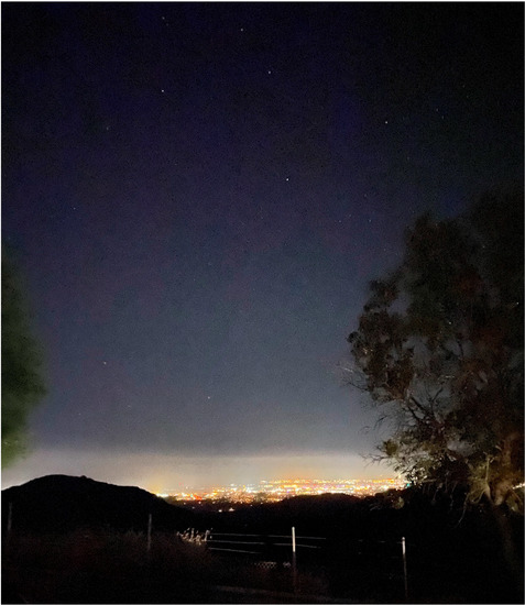 Human-made or anthropogenic lighting has become more prominent as technological advances have created more lighting options and population growth has increased lighting needs. Anthropogenic lighting has increasingly been viewed as a pollutant and ecological stressor, which should be further investigated and addressed with technological solutions and best practices to reduce its potential widespread impacts on wildlife and adjacent habitats [4,5,6,7]. Studies of terrestrial light pollution have been conducted for a wide variety of organisms, but marine life has been less well studied [8,9,10,11]. Reviews of lighting effects on marine life largely focus on the effects on coastal regions where cities and towns can be nearby [12,13,14,15,16,17,18]. Light as a stressor can be broadly categorized as either discrete sources of light, such as individual streetlamps or buoy lights, and skyglow. Skyglow is the diffuse scattered light that brightens the night sky, particularly the anthropogenic portion of skyglow that comes from the light domes of cities and towns, and discussed at length in several reviews [19,20,21,22]. While skyglow can be a naturally occurring phenomenon, human-made skyglow can substantially brighten the night sky by orders of magnitude in unnatural ways, thereby affecting ecological and biological functions [22]. Figure 2 shows skyglow from a city as a diffuse dome of light.