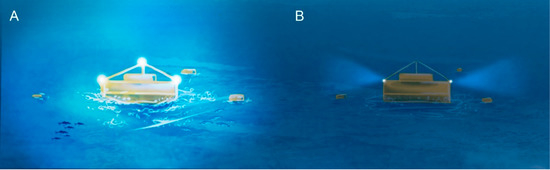 - Keenan, S.F.; Benfield, M.C.; Blackburn, J.K. Importance of the artificial light field around offshore petroleum platforms for the associated fish community. Mar. Ecol. Prog. Ser. 2007, 331, 219–231. [Google Scholar] [CrossRef][Green Version]
