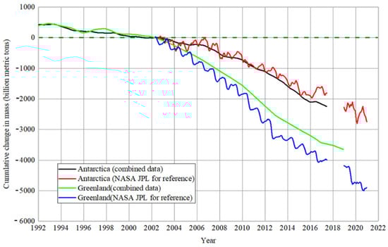 Cumulative mass balance of Greenland and Antarctica, 1992–2020.