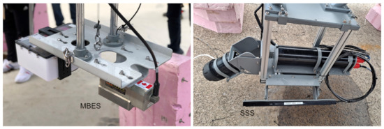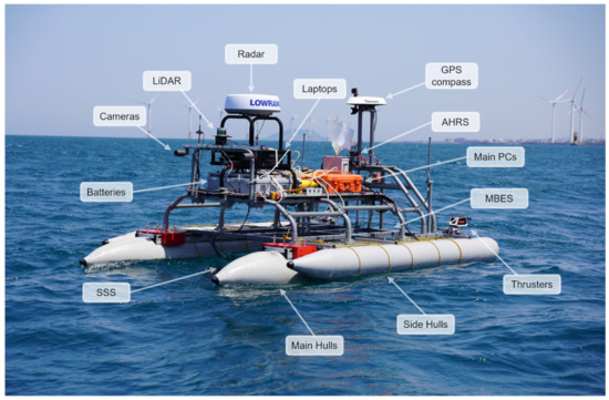 The base platform of the ASV was designed based on a catamaran to enable a differential thrust. The vehicle was integrated above the base along with various component systems, including power, electronic sensors and devices, onboard computers, and wireless communication systems, as shown in Figure 1. The detailed configuration of the installed sonar sensors is shown in Figure 2. The MBES and SSS were installed in the middle of the main hulls on the stern and bow sides, respectively. As the two sonar sensors used different frequencies and did not produce a common multiple, there was zero interference between them.