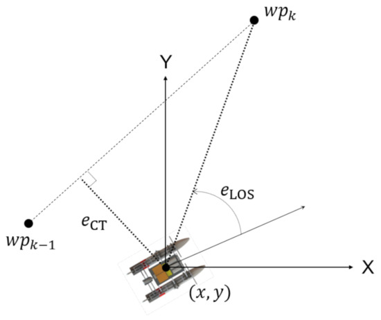 where and are the proportional and differential gain coefficients for the LOS guidance, respectively, and and are the proportional and differential gain coefficients for the CT guidance, respectively. The variables and denote the heading angle error of the vehicle and its differential value. Moreover, and represent the CT error and its differential value, respectively. In addition, is defined as the ratio of the distance to the current goal waypoint from the vehicle position to the distance between the current and the previous waypoints. If is larger than 1, then is set to 1. Accordingly, the weighting of each guidance approach was adjusted using . The definitions of these tracking performance indices are presented in Figure 3.