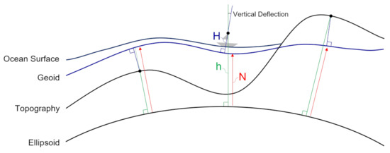 where N and h are the geoid and ellipsoid height, respectively, and both can be obtained from the NMEA 0183 packet data received by the GPS antenna. This relationship is depicted in Figure 4. Note that the vertical deflection (VD) corresponds to the discrepancy between the true vertical and ellipsoid normal. The VD over the field test area was less than 5, implying that the horizontal deviation due to the VD is at most 2.5 mm for the 100 m range measurement. Therefore, we can neglect the VD for the local survey and let .