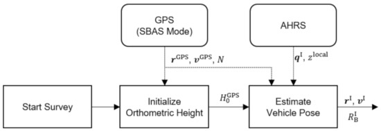 Based on these representations, the overall procedure for the vehicle state estimation can be represented as shown in Figure 5. The vehicle state estimation combines measurements from GPS and the absolute heading reference system (AHRS). In particular, the GPS provides position information , where , , and h are the geodetic coordinates represented in a reference ellipsoid (e.g., WGS84). Owing to the geometric configuration of the satellite constellation, GPS usually has a higher dilution of precision (DOP) in the vertical direction than in the horizontal direction. Thus, it has larger uncertainty in the vertical estimation. Typical GPS position accuracy running in satellite-based augmentation system (SBAS) mode shows 0.3 m and 0.6 m in horizontal and vertical axes, respectively. Therefore, having additional altitude information from a more accurate sensor is required. In this regard, we employed a survey-grade AHRS for both heave and orientation estimation.