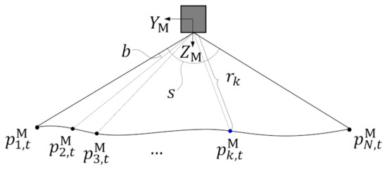 Bathymetry measurements using the MBES are shown in Figure 6. Given the sonar scan width s and beam spacing b, we can transform the sonar ranges into sonar point clouds represented in a MBES-sensor-fixed frame {M} as follows: