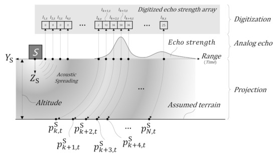 To generate a sonar image, the image surface must first be defined. Generally, the SSS image is created on a plane by linearly projecting the received array of sonar echo intensity onto this plane. However, this approach generates increasing distortions in terms of pixel positions because the actual sonar projection is not linear. Therefore, we assumed a virtual terrain surface below the sonar head and radially projected the sonar echo value onto the surface to reduce the distortion of the sonar image. A virtual surface was created using the altitude between the vehicle and underwater terrain based on the measured SSS echo strength. Further, height of the virtual surface varied according to the altitude and attitude of the vehicle. The sonar images were then generated by aggregating the SSS sonar pixels from the port and starboard sides, as shown in Figure 7.